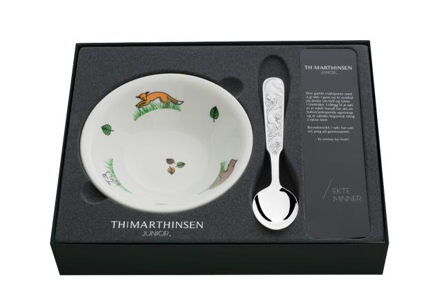 Et eventrylig barnebestikk med håndmoddelert motiv av Bjørn, Rev og Hare. En barneklassiker gjennom generasjoner.