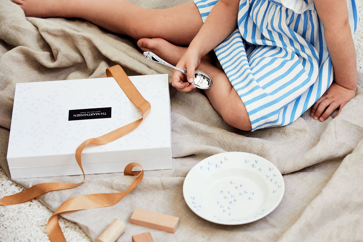 Dette gavesettet består av en samleeske med oppbevaringsplass, en porselenstallerken produsert hos Figgjo, en sølvskje og en bestikkpose for oppbevaring av 6 deler bestikk.