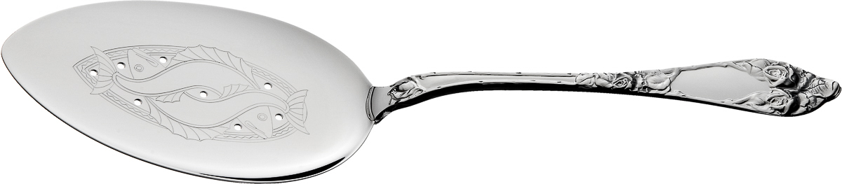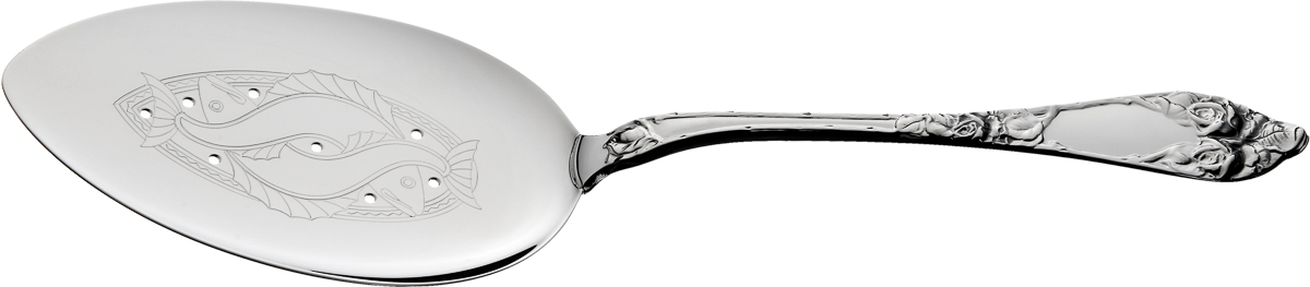 En elegant detalj til fiskemåltidet. Fiskespaden gjør det enkelt å servere fisk. Det brede bladet tar godt vare på fiskeskiven og hullene gjør at vannet renner av før servering. Har du dekket på med fiskebestikk i sølv ligger alt til rette for et utsøkt måltid slik råvaren fortjener.
